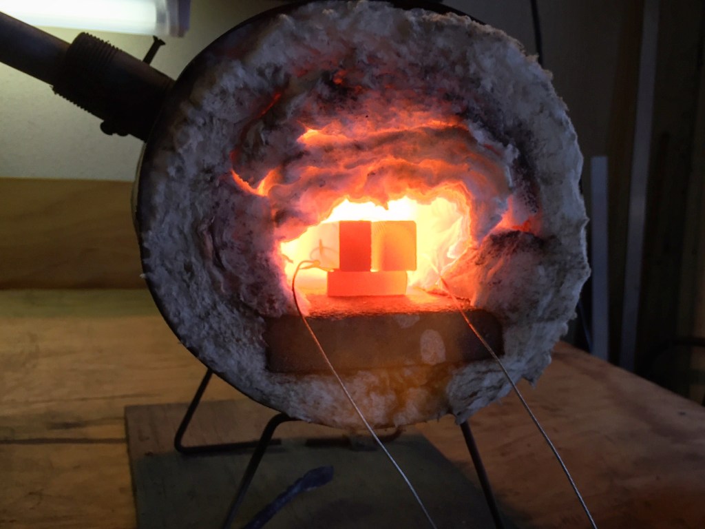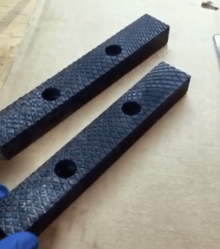After cleaning up the jaws, they were placed in an oven at 500 degrees Fahrenheit for approximately 180 minutes. This reduces the jaws’ hardness, but increases ductility. The tempering process is akin to partial annealing of steels.