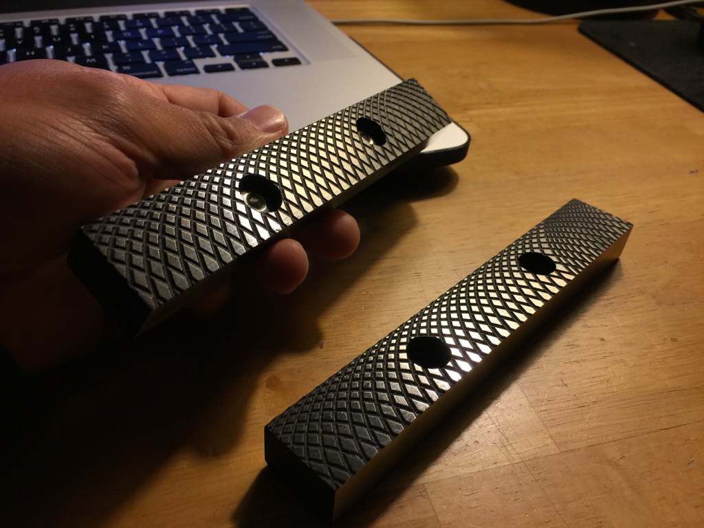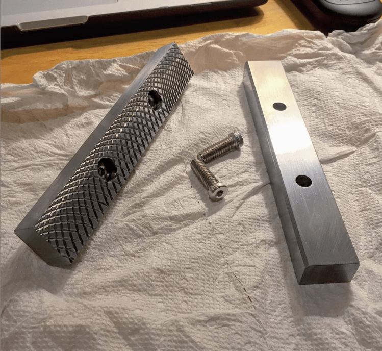 I then deburred the jaws. This was done on a standard belt sander. It removed the burrs from the guilloché. I also chamfered the edges to provide a clean bearing surface for the jaws, once they’re installed. Lastly, it allowed me to flatten all surfaces, so when the vise is used, equal pressure is applied throughout the length of the jaws.
