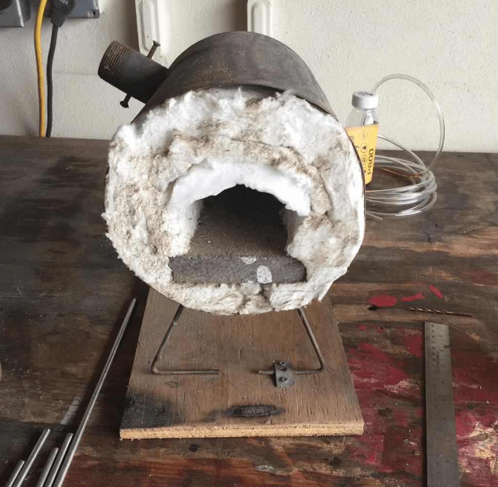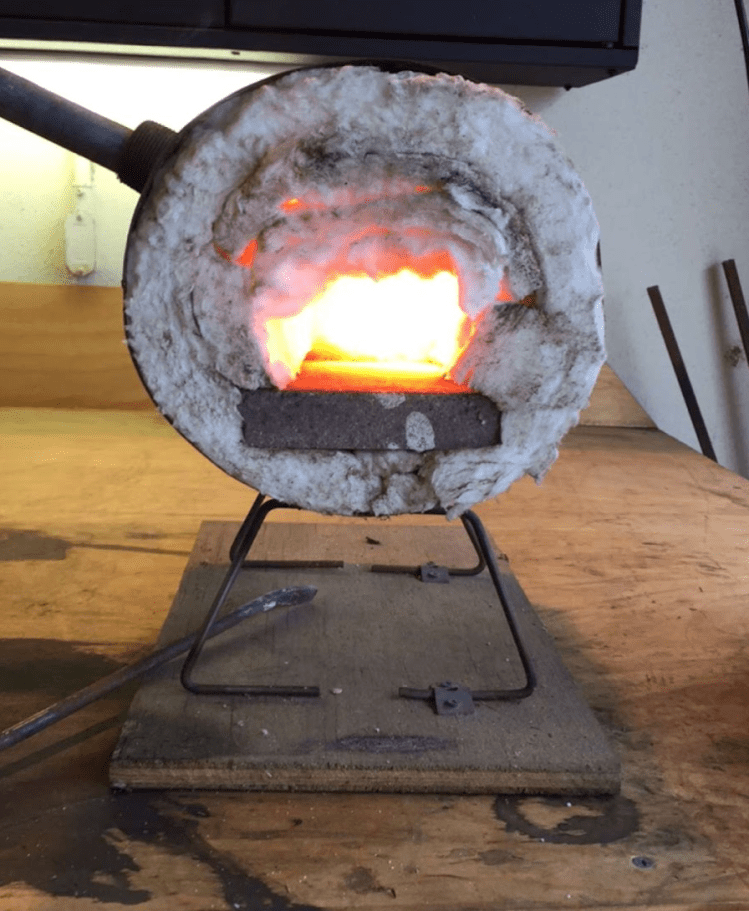 I built a propane forge in middle school that was well-suited to this task. The forge body is a steel shell from a manual-pump pesticide sprayer. It is lined with Kaowool, a brand of ceramic wool. The forge floor is typical firebrick. The propane burner is a custom design – it uses black iron pipe with reducing bell with cross-drilled holes. The holes hold a horizontal bar with a singular nozzle with a small orifice. The orifice projects propane gas down the tube, and entrains a flow of air in the process, providing a mixing effect.