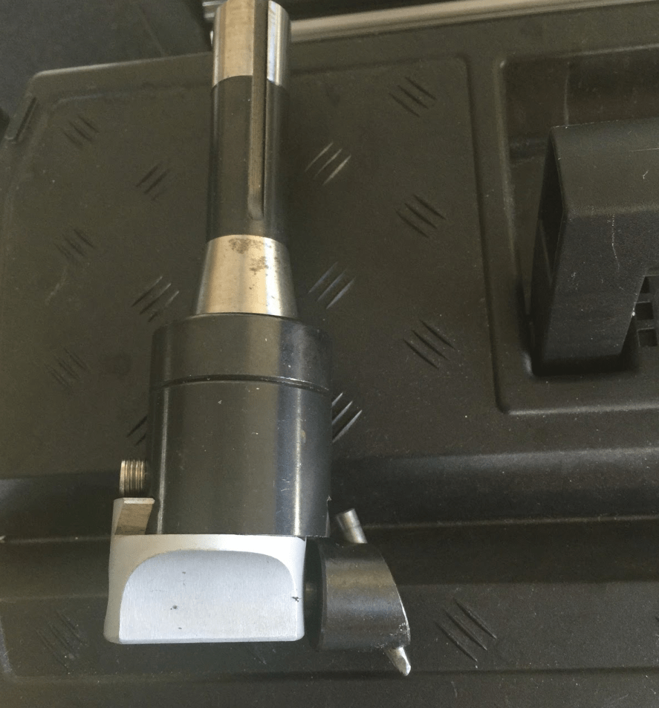 I hand-ground a broken 1/4″ diameter carbide router bit to cut this pattern. The tip of the bit was ground with an angled 45-degree triangular shape, so that it would cut a groove oriented correctly when inserted into a boring head:
